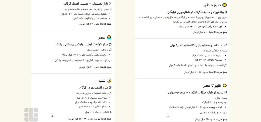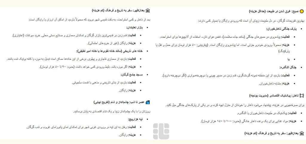 چتبات openai روز را به 4قسمت تقسیم کرده است که هر کدام فعالیتهای مشخصی را نشان میدهد. در این برنامهریزی فقط 1 تفریح رایگان وجود دارد؛ پیادهروی و طبیعتگردی در ناهارخوران.