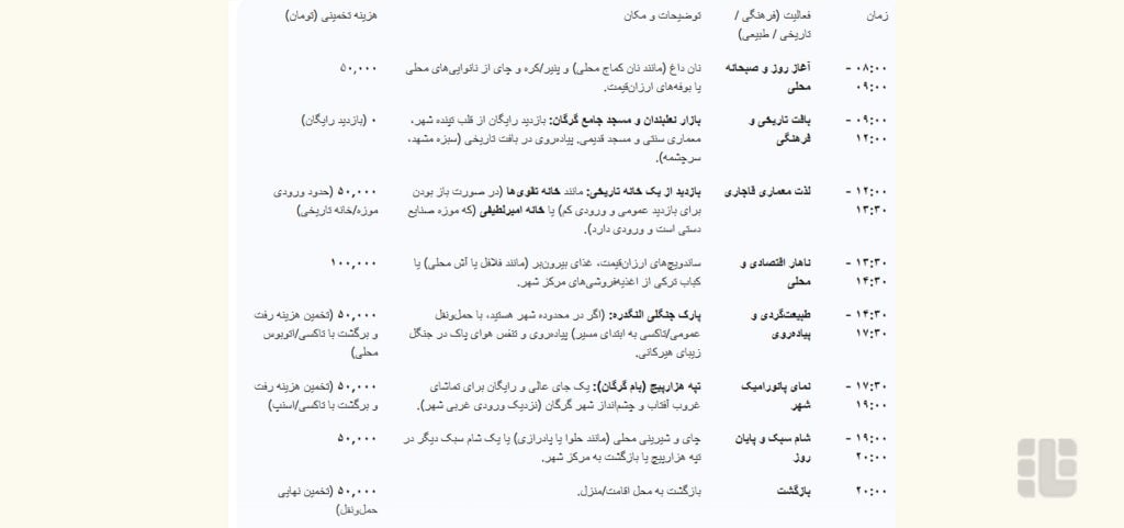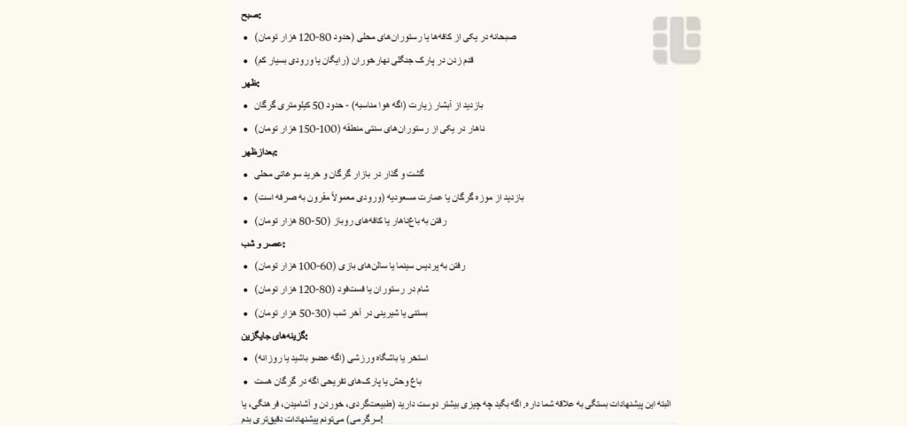 «در شهر گرگان، یک برنامه تفریحی کامل برای یک روز (از صبح تا شب) با حداکثر بودجه 500,000 تومان (شامل حمل و نقل، غذا و فعالیتها) طراحی کن. برنامه باید شامل فعالیتهای فرهنگی، تاریخی یا طبیعی باشد و برای یک نفر مناسب باشد. لطفاً برنامه را به صورت ساعتی (یا بخشبندی شده) و با ذکر دقیق هزینههای تخمینی برای هر بخش ارائه دهید.»