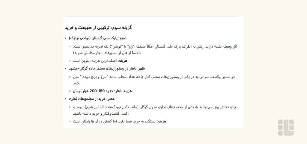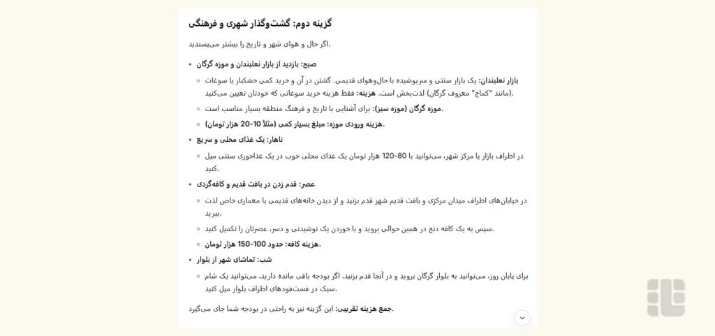 در پاسخ به پرامپتی، چت جی پی تی این گونه شروع کرد: «حتماً! این یک نسخهی کاملاً کاربردی، محلیسازیشده و قابل اجراست برای یک روز کامل تفریح در گرگان با بودجهی ۵۰۰ هزار تومان — از صبح تا شب، قدمبهقدم»