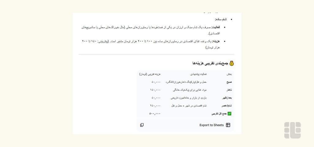 هوش مصنوعی گوگل تقریبا جواب مفصلی داده است. برای صبح دو پیشنهاد وجود دارد و مهمتر از همه اینکه به هزینه رفتوآمد دقت کرده است.