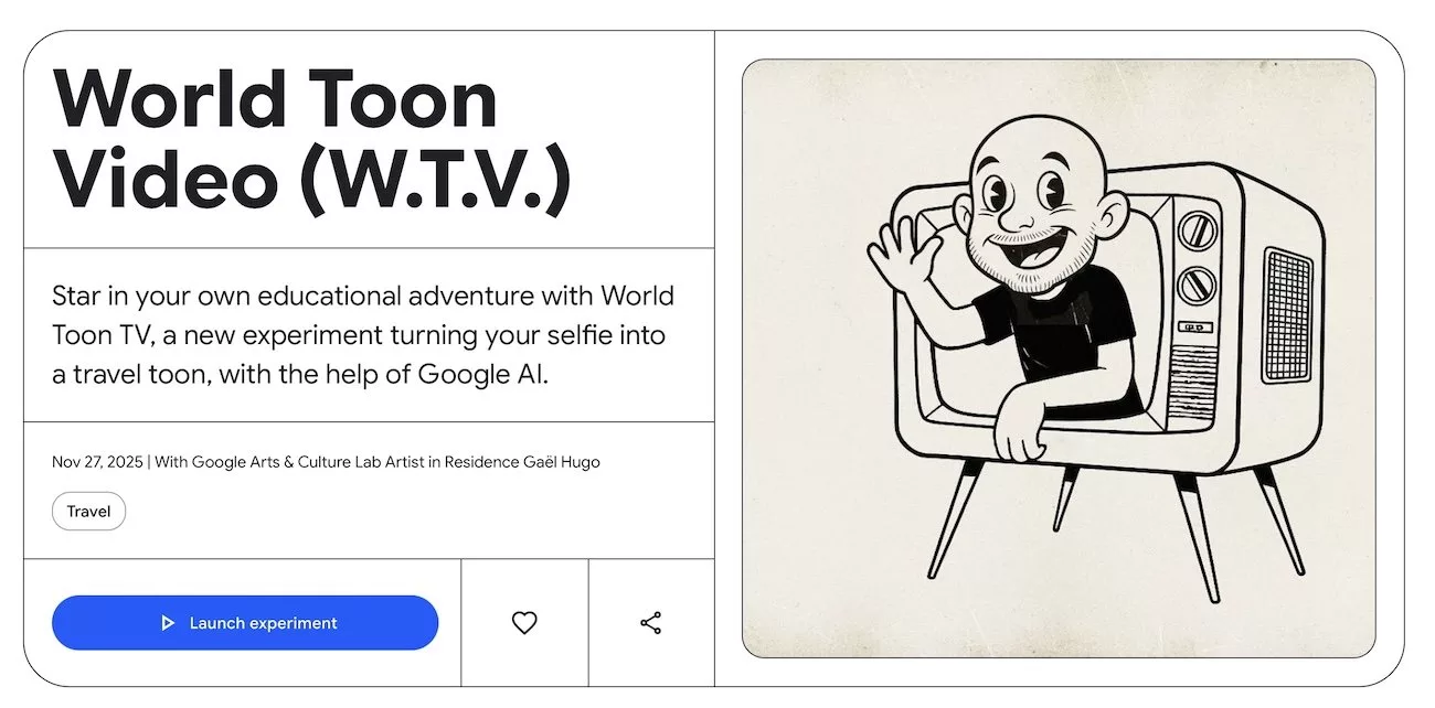 اولین قابلیت جدید Arts & Culture گوگل، World Toon Video است؛ ویژگیای که در آن میتوانید عکس سلفی بگیرید و آن را بهصورت کارتونی، عروسکی یا نقاشی درآورید. سپس یکی از چهار صحنهی World Landmarks (مکانهای روی زمین)، Nature Wonders (جاذبههای طبیعی)، Beyond Galaxies (خارج از کرهی زمین) یا Historical Moments (مواقع تاریخی) را که هرکدام شامل گزینههای بیشتر هستند را انتخاب کنید. هوش مصنوعی پس از شناسایی انتخابها، کاراکتر و محیط را طراحی کرده و آن را به یک کلیپ کوتاه تبدیل میکند.